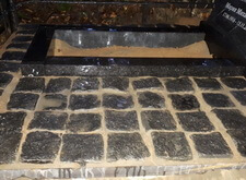 Взамен старой плиты устанавливаем небольшое надгробье из гранита перед массивной стелой, оформляем у его подножья цветник. Периметр получившейся композиции выкладываем гранитной брусчаткой. В результате у нас получилось бюджетная реконструкция половины места захоронения, второй частью клиент не позволил заниматься по личным причинам.